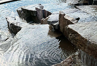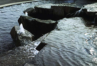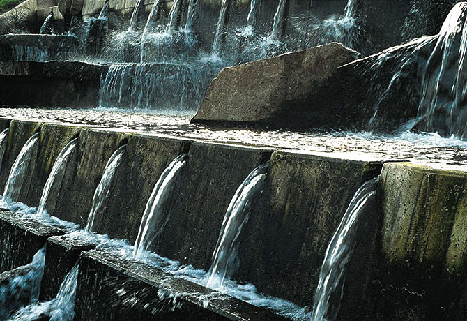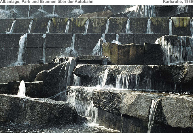 ![]() In Karlsruhe zertrennt der Neubau einer Autobahn zwei Stadtteile. Zur Schonung der Umwelt wurde die neue Südtangente übertunnelt. Ich wurde beauftragt für diese Situation ein Lanschaftskonzept mit einer zentralen Wasserskulptur zu entwickeln und zu planen. Die Brunnenanlage sollte mit dem Flußwasser der Alb gespeist werden. Statt die Großbaumaßnahme zu kaschieren und eine Wasseridylle zu schaffen, habe ich die Betonkanten des Tunnelbauwerkesin voller Höhe und weit über den zentralen Bereich hinaus sichtbar gemacht. Zwischen einer Seefläche auf dem Tunnel und einertiefer gelegenen Seefläche auf der Höhe des Uferweges erstreckt sich auf dem Dach des Betriebsbauwerkes eine vielgliedrige Wasser und Kaskaden Landschaft Technisch präzise Betonwände und diagonal dazu eingelegte Sinterterraßen aus Granit bilden den Rahmen dafür. Das Wasserbild besteht aus dem großen neun strahligen Fächer über dem See auf dem Tunnel, und der zwei gegliederten 8 m hohenKaskaden. und Wasserlandschaft. Inden mit Naturstein belegten Sinterterrassen bildetdas Wasser organische Formen und Schleier. Durch artesische Leitungen entstehen ohne zusätzliche Pumpen einzelne aufwärts gerichtete Wasserformen. Eine zentrale Steinskulptur und zwei Steinsetzungen binden die Wasseranlage in die Modellierung der Landschaft ein. |