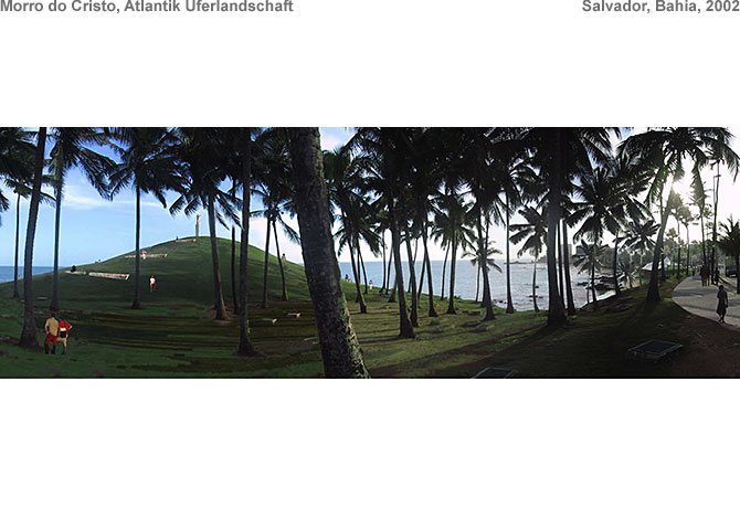 Morro do Cristo, Salvador - Bahia Projeto para recuperação e recomposição integral. O Morro do Cristo, um dos cartões postais principais da cidade, é por sua própria natureza de uma beleza extraordinária. Formando uma pequena península no Oceano Atlântico e recebendo a escultura do Cristo, cria um encanto todo especial. Rodeado pelo oceano e cercado pelos coqueiros no lado da cidade, o morro é um lugar muito procurado para descanso e contemplação. Frente a imensidão do oceano pode-se sentir parte da natureza. Um sentir calmo e distante da cidade barulhenta e dinâmica, que está tão perto. Um lugar ideal para o sossego. O estado atual do Morro do Cristo está limitando bastante os efeitos dessas qualidades. O meu projeto propõe, em ligação com a futura ampliação do passeio, melhorar sensivelmente essa situação, com algumas medidas dirigidas que vão recuperar e mostrar as qualidades possíveis do lugar. |